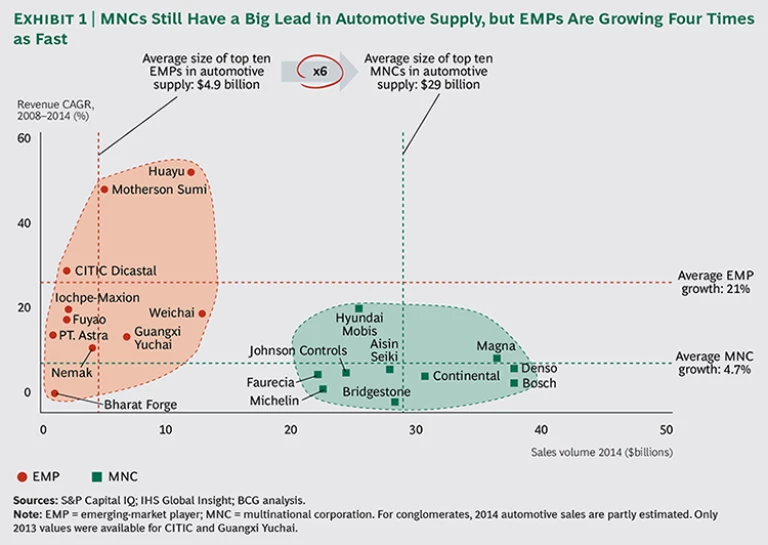 This shift to emerging markets, however, is not yet reflected in the size of automotive suppliers: the ten largest MNC suppliers have an average of $29 billion in annual revenues, which is almost six times the average annual revenue level of the top ten EMPs. (See Exhibit 1.) Nevertheless, the shift of car manufacturing to emerging markets enabled these EMPs to achieve rapid growth that averaged 21 percent annually from 2008 through 2014; the MNCs grew at a much slower pace during that period.