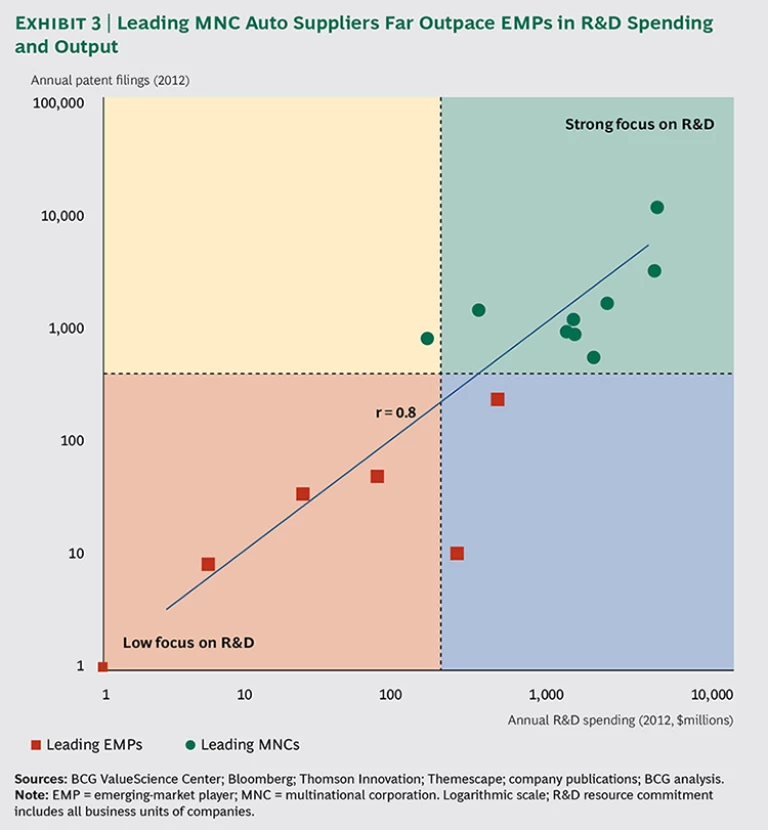 - Close the technology gap. The majority of EMP executives we interviewed cited catching up in technology as their first strategic priority. Despite progress by EMPs in segments such as interiors, passenger restraints, wheels and tires, fuel systems, and body glass, MNC suppliers are still perceived as dominating technology in core components, such as engines and transmissions. Closing the technology gap will require EMPs to overinvest in R&D, yet many continue to underinvest. Pressure to innovate is coming not only from the aggressive R&D agenda of many MNCs but also from stricter regulatory standards in both emerging and developed markets. Rising standards for emissions and fuel efficiency, stricter car-recall policies, and enforced repair and replacement guarantees by OEMs will require EMP suppliers, as well as MNCs, to improve product technology and quality just to stay in the market.