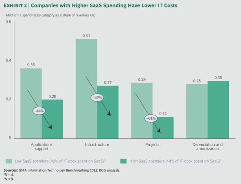 High-volume users of SaaS see as much as 61 percent lower IT costs compared with low adopters of SaaS. (See Exhibit 2.) While the benefit can be substantial, CIOs starting the journey should be prepared to manage the challenges that come with SaaS deployments: