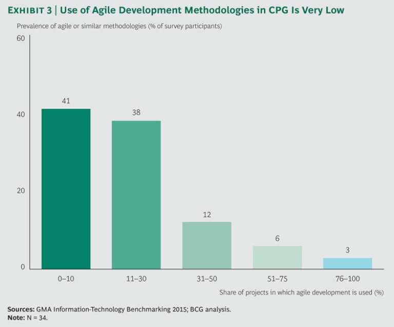- With agile methodologies, however, the story is quite different. Although agile is widely used in the new generation of high-tech and e-commerce companies and is quickly spreading to other technology companies and to the e-commerce divisions of large companies, our survey of 37 CPG manufacturers in the U.S. and Europe reveals that the CPG industry is a laggard when it comes to agile adoption. This is a tremendous opportunity for CPG CIOs. Agile can help reduce costs, increase application development speed, and improve developer productivity.
