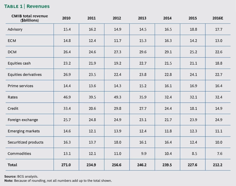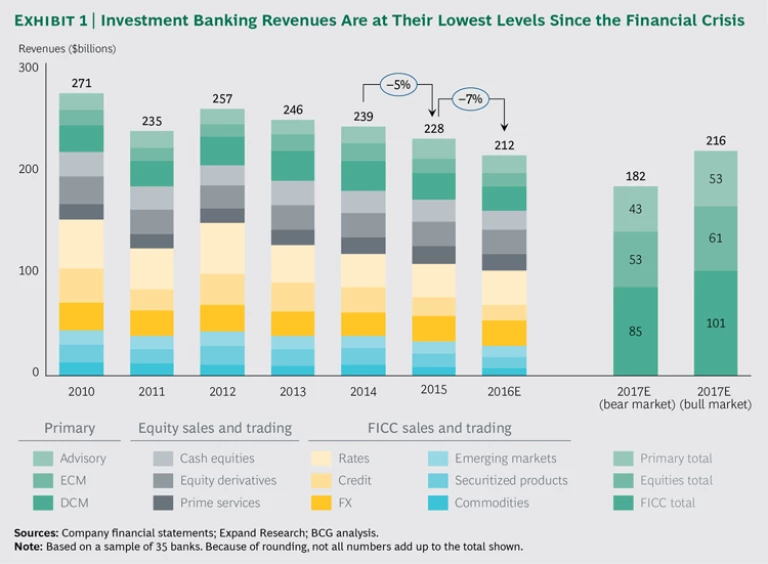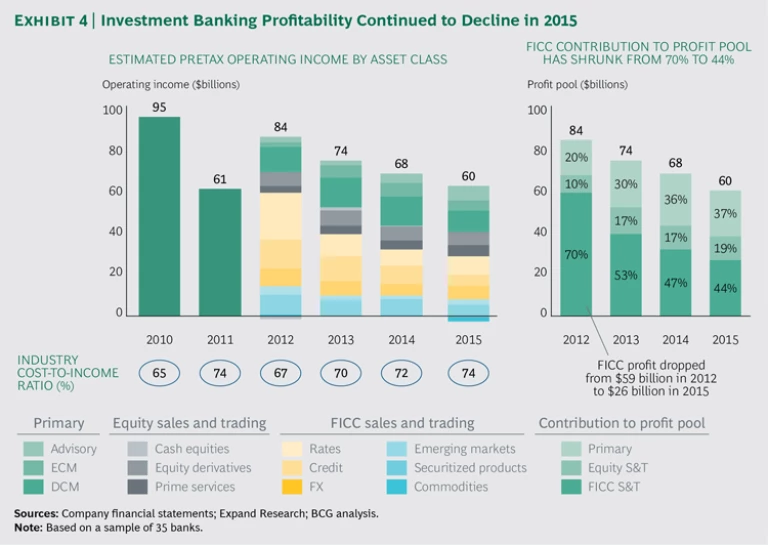 Unfavorable economic conditions, escalating capital requirements, and stubbornly high costs continue to depress the performance of many investment banks. Their collective 6% ROE in 2015 capped off five years of dismal revenue results.