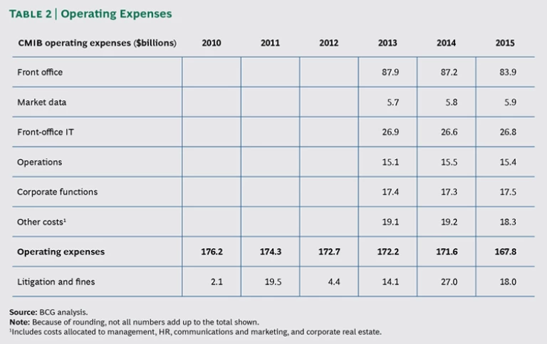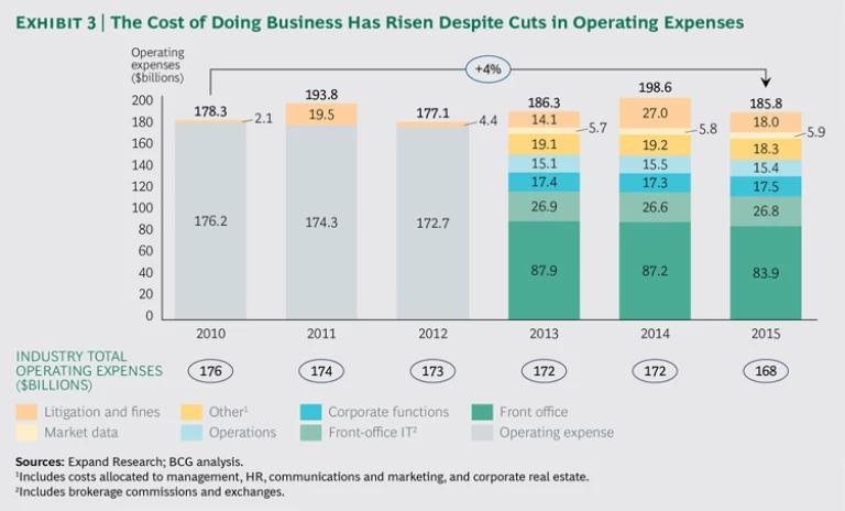 On the positive side, several major investment banks are finally benefiting from successful cost reduction programs. Business line transformations, strategic exits, and rationalization have begun to filter through to the bottom line. Operating expenses YOY fell by 2%, driven primarily by reductions in head count, operational spending, and lower litigation expenses. Yet since 2010, and despite cuts of roughly $8 billion in operating expenses, the overall cost of doing business for investment banks has risen by 4%. (See Exhibit 3.)