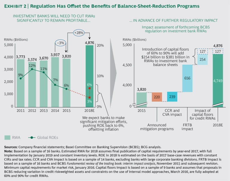 We estimate that the new regulations will lead to a 28% increase in investment banks’ RWAs. If we assume a base-case revenue projection of about $200 billion in 2017 (a decline of 13% from 2015), and no improvement in the current cost base, the increase in RWAs resulting from regulation could drive down ROE for investment banks from 5.7% to 3.4%. Given a cost of capital of 10% to 15%, an ROE of just 3.4% would mean that banks would fail to cover their cost of capital by a significant margin, necessitating further cuts to their balance sheets. Management will seek to deleverage, rather than increase the share of their balance sheet dedicated to capital markets. That said, mitigation efforts have generally struggled to keep pace with both the regulatory agenda, which has raised the bar significantly on risk management, as well as the rate of revenue deterioration. In 2015, banks managed only a 3% reduction in RWAs, to $3.8 trillion (net of FX adjustments).