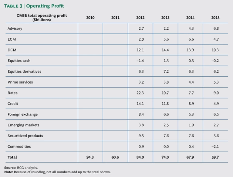 As a result, the overall profit pool for investment banking fell from $68 billion in 2014 to $60 billion in 2015. (See Exhibit 4.) The downturn was driven by a combination of declining revenues and escalating CIRs, with each percentage point rise in the CIR costing the industry, on average, about $3.7 billion in profit. Of course, CIRs vary dramatically by business line. At one end of the spectrum, the CIR for commodities—which posted a revenue loss in excess of $2 billion in 2015—ranges from 90% to 110%. Highly electronic markets, such as cash equities, also have a CIR that can exceed 100%. Indeed, despite the increase in cash equities revenues in 2015, the business line did not manage to break even. DCM and M&A were among the most lucrative business lines in 2015, posting profits of $10 billion and $7 billion, respectively. Primary markets have some of the lowest CIRs in the industry.
