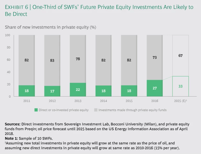 We believe that SWFs’ share of direct private equity will eventually account for about one-third of all new private equity investments. (See Exhibit 6.) As they and pension funds grow their active investments, some may seek other approaches. One Canadian pension fund announced in 2017, for instance, that it was considering funding its own private equity investments and assessing the potential of setting up a separate vehicle for private equity deals. Doing so would allow it to address criticisms over high fund fees and limited disclosures. In addition, by leveraging its existing co-investment program, the fund could access needed private equity expertise to go direct. The fund would also establish “no fly zones” to ensure that target opportunities did not compete with current private equity investments.