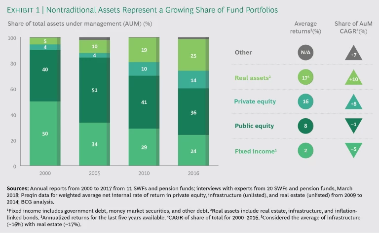 For many years, fixed income and public equity assets served as the backbone of most principal investor funds—comprising approximately 90% of all assets under management (AuM) in 2000. However, that long-standing investment tradition came into question as long-term yields in fixed income investments began to decline and public equity performance became increasingly volatile. Meanwhile, other nontraditional asset classes were thriving, led by private equity and real assets (real estate and infrastructure) that since 2000 have delivered a steady CAGR of 8% and 10%, respectively. (See Exhibit 1.) At one Canadian pension fund, for instance, fixed-income holdings went from 95% of total AuM in 2000 to just 16% by 2016, while private equity holdings grew from 0% to 19% over the same period.