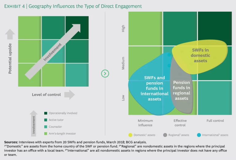 SWFs and pension funds with investments in international assets are far more likely to take an arm’s-length approach, given the challenge that geographical distance poses to direct engagement. Funds diversifying abroad, for instance, typically invest in a minority position and generally prefer low exposure to avoid any negative impact on their reputations if something goes awry. (See Exhibit 4.)