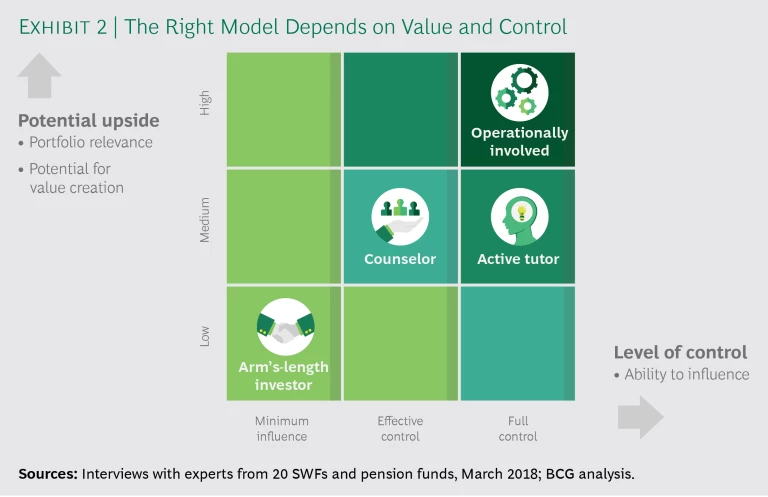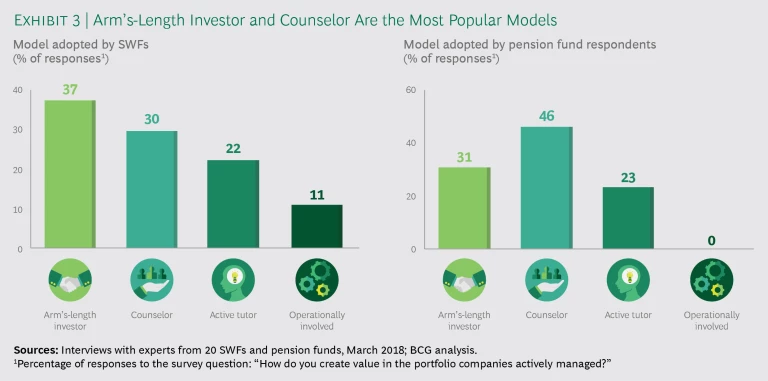 For these reasons and because direct investment remains a relatively new approach for principal investors, most people we surveyed said they opt for modest levels of engagement: 67% of SWFs and 77% of pension funds use the arm’s-length model or counselor model; 22% of SWFs and 23% of pension funds use the active tutor approach. By contrast, only 11% of SWFs and 0% of pension funds take an operationally involved role. (See Exhibit 3.) Limiting direct engagement makes sense initially, given the resource investment and internal changes required.