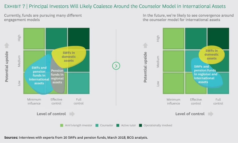 Principal investors will use the counselor model for international assets. The active management approach for most principal investors is likely to plateau in international assets. Skilled resources are hard to find and expensive to hire. To secure additional required capabilities, investors will need significant scale in direct private equity. Therefore, we believe principal investors will likely converge around a counselor model in which they will reassess whether active management can deliver the promised value creation. (See Exhibit 7.) They will also reassess the tradeoff between building an in-house team versus co-investing or investing in funds that demonstrate best-in-class capabilities. Larger funds will likely create more value by building in-house teams, and many have the scale to fund such a change. Principal investors will also need to reassess what it would take to move up to becoming more operationally involved in order to generate additional value.