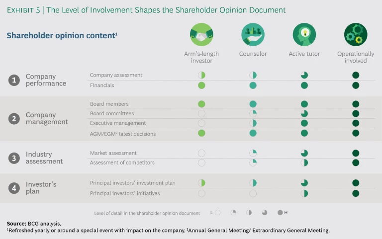 Shareholder Opinion and the Investment Thesis. This includes an assessment of the portfolio company and development of the investor’s view in order to help communicate the investment objectives to all stakeholders. The amount of detail provided in the shareholder opinion document depends on the level of principal investor involvement, with operationally involved investors providing the most extensive information. (See Exhibit 5.)