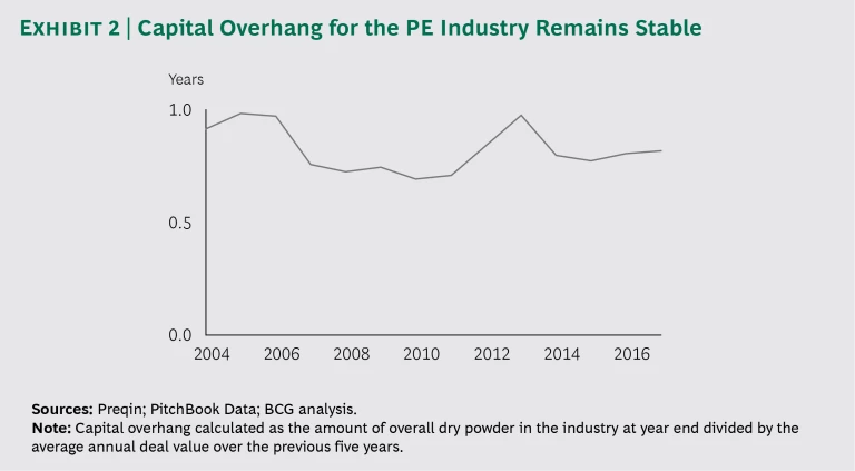 Even factoring in the currently high levels of dry powder, the industry is still managing to deploy capital at a record rate ($1.18 trillion worldwide in 2017, up from $1.13 trillion in 2016). (See “Finding New Deal Sources.”) Consider capital overhang, or the amount of time it would take at current deployment rates to invest every dollar that PE firms now hold. As Exhibit 2 shows, the current overhang level sits at about one year, roughly where it has been throughout the last decade.