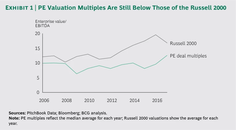 Despite the negative indicators, we have a positive outlook for growth, and investors do too. (See “Three Ways That the PE Model Creates a Unique Advantage.”) PE valuations are certainly high, yet firms in the aggregate still pay less for assets than the public markets. Exhibit 1 shows buyout multiples compared with Russell 2000 multiples.