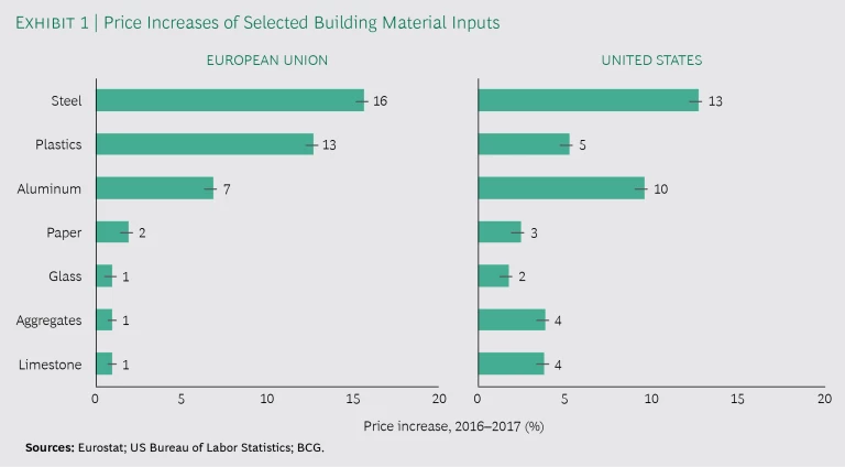 Input costs spiked in 2017. From 2012 through 2016, prices of major inputs for building materials in Europe and the US either declined from year to year, on average, or saw only slight increases. That dynamic changed suddenly in 2017, when European prices for raw materials spiked: steel by 16%, plastics by 13%, and aluminum by 7%. The US market experienced similar price spikes. (See Exhibit 1.) These increases put the margins of building materials producers under considerable pressure.