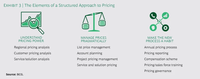 As noted above, the case for raising prices on building materials in the current environment is compelling. BCG has identified three steps that will enable building materials producers to gain a more data-driven understanding of their position and pricing power, to choose more pragmatically among opportunities to raise prices, and to anchor these new processes within their organizations. (See Exhibit 3.)