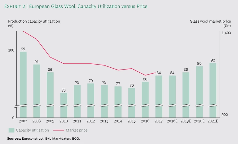 This link between price and capacity utilization is not limited to glass wool in Europe. Whenever demand starts to improve, producers in other building materials industries initially grow profits by filling their factories, reducing their average costs, and selling more volume. These are common and effective responses, which also explain the occasional lag between the uptick in capacity utilization and the corresponding uptick in prices. But volume growth inevitably reaches its limits as a source of profits, forcing producers to raise prices more sharply as capacity utilization increases.