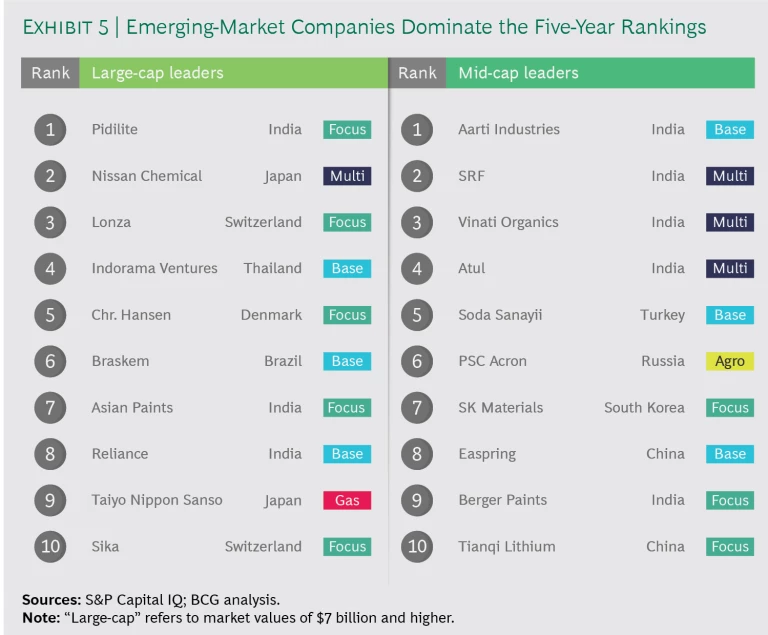 Certain chemical specialties were associated with particularly strong returns in the latest five-year period. For instance, of the 20 focused-specialty companies with the highest TSRs, 13 participate in the fields of electronic chemicals, food ingredients, or paints and coatings.