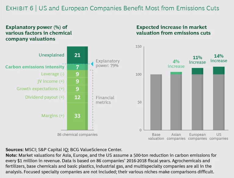 Especially for companies with large carbon footprints, there appears to be an opportunity to obtain better valuations in capital markets if they take steps to reduce their emissions. For now, the opportunity is greatest in Europe and the US. In these regions, where awareness of sustainability issues is most deeply engrained, our research shows that valuations can get more than a 10% boost for every 500-ton emissions reduction per $1 million in revenue. The effects in Asia are nowhere near this level. (See Exhibit 6.)