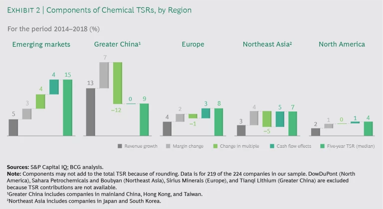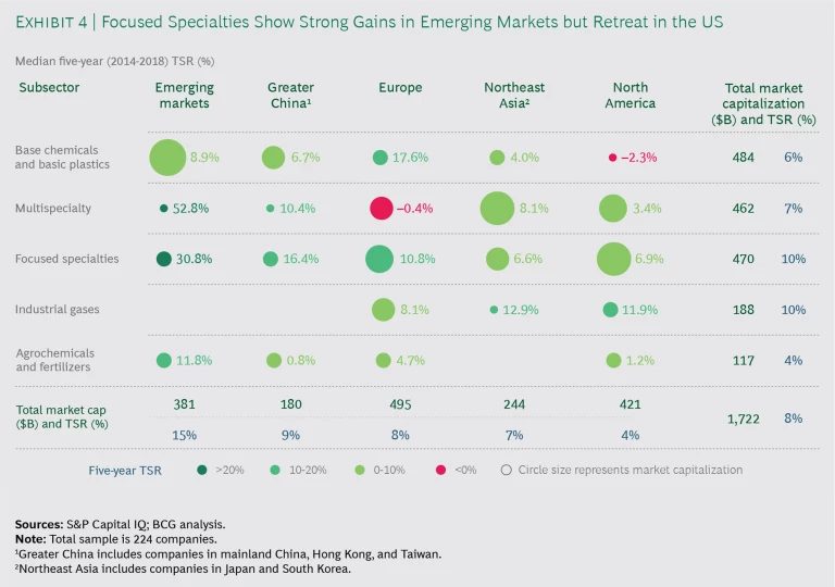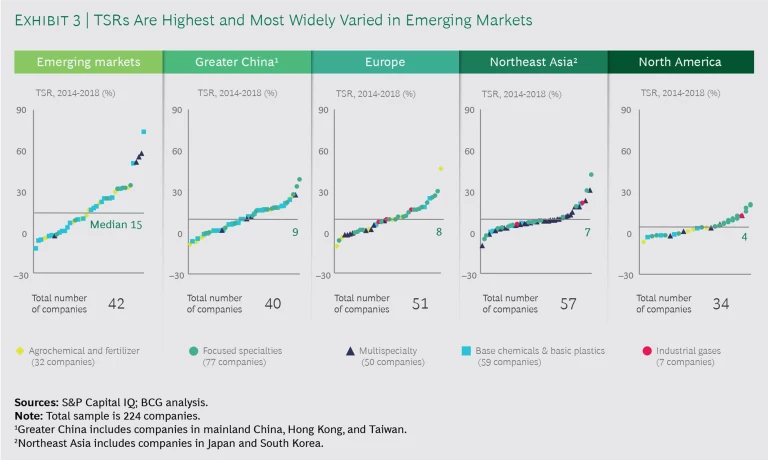 One of the interesting developments in the latest period is the reversal of fortunes between Europe and North America, the two biggest chemical regions from the standpoint of public-company market values. Not that either region avoided the 2018 downdraft. There were plenty of poor TSR performers in Europe, especially in Germany and in the multispecialty subsegment. But there were also some big winners in Europe’s large-cap cohort, including the pharma ingredients and additives company Lonza (five-year TSR: 28%), the food ingredients company Chr. Hansen (24%), and the flavor and fragrance producer Givaudan (16%). These companies helped European chemical TSRs (at 8%) surpass North American TSRs (4%, a worldwide worst) for the first time since 2008-2012. (See Exhibit 3.)