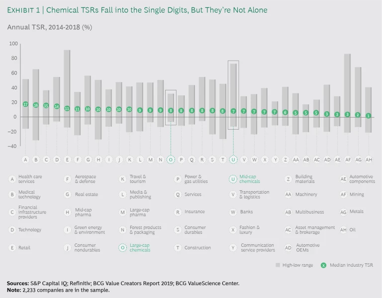 There’s no sugar-coating the situation: 2018 was a bad year for chemical shareholders, with the industry losing $263 billion in market value globally. The value destruction in 2018 wasn’t limited to chemical companies, of course; it happened in every industry. (See Exhibit 1.) In the case of chemicals, however, the decimation essentially halved companies’ five-year returns. The TSRs of large-cap chemical companies—the average compounded return an investor would have gotten in each year—fell from 16% between 2013 and 2017 to 8% between 2014 and 2018.