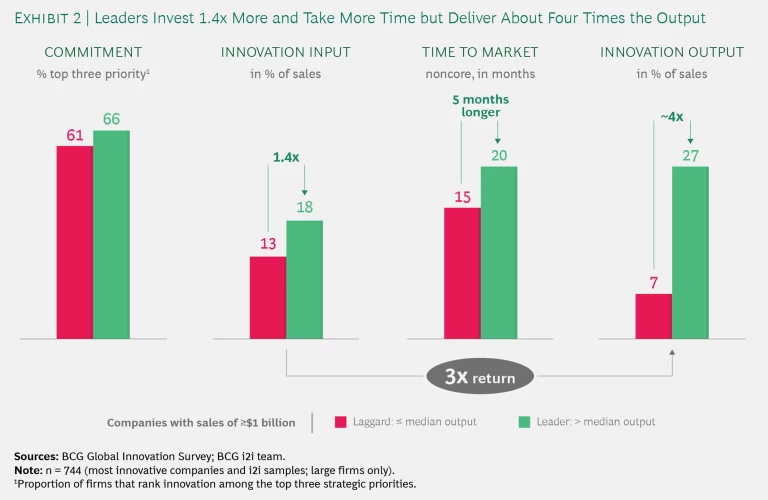Large innovators that outperform their big-company peers put more money behind their innovation programs—1.4 times more as a percentage of sales—and they get far greater payoffs: four times as much as a percentage of sales. (See Exhibit 2.) Surprisingly, they also take time to get things right, with large leaders reporting average times to market for innovation outside their core that are up to five months longer than the times for others.
