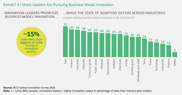 Leading large innovators pursue different priorities and more carefully design their innovation systems for impact. Laggards must first put a lot of attention into fixing the basics: building new and critical incubation or development skills, gaining leadership support, and establishing strategic clarity on the direction of innovation efforts. Leaders seem to have the luxury to address higher-order issues, however, such as filling gaps in product-market fit and building a stable of scalable external partners. Leaders are also about 15% more likely to prioritize business model innovation although not uniformly across industries. (See Exhibit 4.) Innovation at the business model level—to defend existing profit engines, to imagine entirely new offerings in response to emerging customer needs, or to adapt current business models to ongoing shifts in the business environment—can provide an important edge, particularly in turbulent environments.