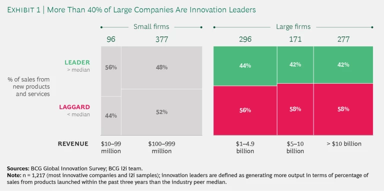 But not all large companies are alike. More than 40% of the big companies (defined as $1 billion or more in revenue) in our 2020 sample overcome these two key obstacles. They fall into the innovation leaders category—that is, they generate a larger percentage of sales from products or services launched within the past three years than their industry median. This compares with on average 50% of the smaller firms surveyed. (See Exhibit 1.) So, smaller companies are more likely to outperform the large firms, but the difference is small in magnitude and not statistically significant.