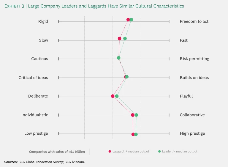 So among the larger innovators, what are the key differences between the leaders and the laggards? To our surprise, culture does not appear to be one of them. In fact, the cultures of large companies, both leaders and laggards, look very similar. (See Exhibit 3.) Granted, an innovation culture is notoriously hard to describe or assess. Still, the data suggests culture may not be a precondition for, but rather have a correlation with—or even be an outcome of—innovation success.
