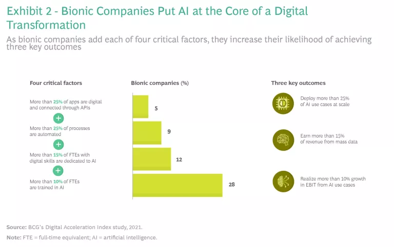 Bionic companies that have four critical factors improve the likelihood of achieving three key outcomes. (See Exhibit 2.) Interestingly, when measuring the incremental benefits of each factor, training employees in AI gave companies the biggest boost. After adding the first three factors, only 12% of bionic companies achieved all three key outcomes. But after training employees in AI (the fourth factor), 28% of bionic companies achieved the outcomes. Bionic companies recognize the benefit, and 54% of those in our study plan to upskill more than 20% of their workforce in AI and machine learning in 2021.