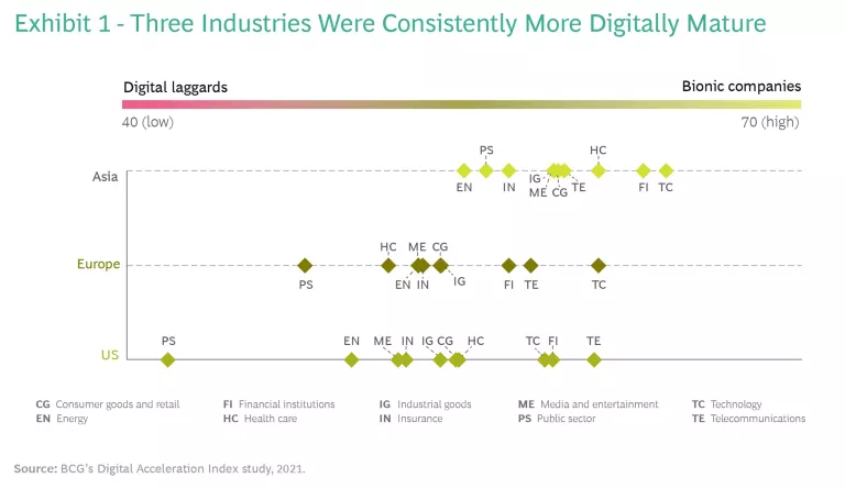 Although bionic companies are found in all industries, our research shows that some industries are well ahead in terms of digital maturity; foremost are financial institutions, technology, and telecommunications. (See Exhibit 1.) These three have maintained their positions as the most digitally mature industries for several years, which is not surprising given the digital nature of the products and services they offer. But the pandemic has clearly accelerated the digital development of consumer goods and retail as well as health care, improving their digital maturity significantly from 2019 through 2020. Their DAI scores rose 8 points and 5 points, respectively.
