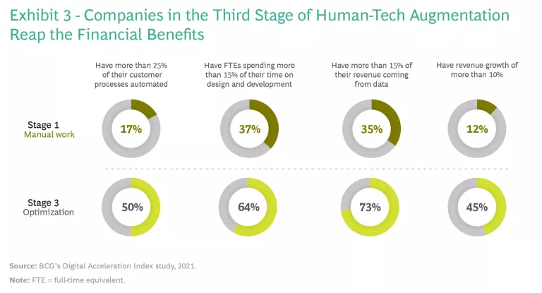 When it comes to HTA, bionic companies outpace digital laggards by a DAI score of 40 to 50 points, according to our global study. A whopping 72% of bionic companies are in the second or third HTA stage, whereas only 9% of digital laggards have evolved past the first stage. The financial impact is significant. Companies in the third HTA stage are twice as likely as those in the first stage to produce more than 15% of revenue from data, and they are almost four times as likely to grow revenue by 10% at a minimum. Of stage three companies, 50% have automated more than 25% of their customer processes—about three times the percentage of stage one companies. By leveraging technology to automate many processes or tasks, employees can spend more time on design and innovation: 64% of companies in the third HTA stage dedicate more than 15% of full-time equivalents’ time to design and development activities; only 37% of companies in the first stage do the same. (See Exhibit 3.)