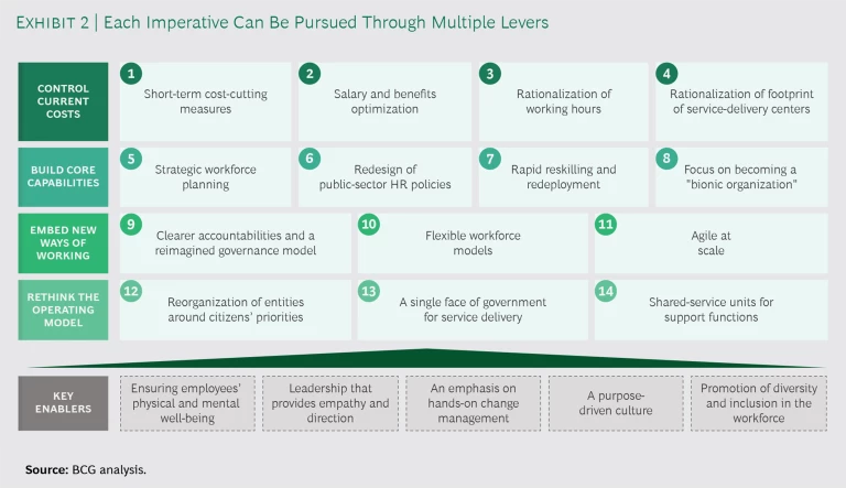 Across these four imperatives for government entities, we have defined 14 possible levers for action, ranging from short-term to longer-term measures. (See Exhibit 2.) How a government chooses to prioritize among them will depend on its specific challenges and strategic needs, and on how feasible individual levers are to implement, given the prevailing political and regulatory climate.