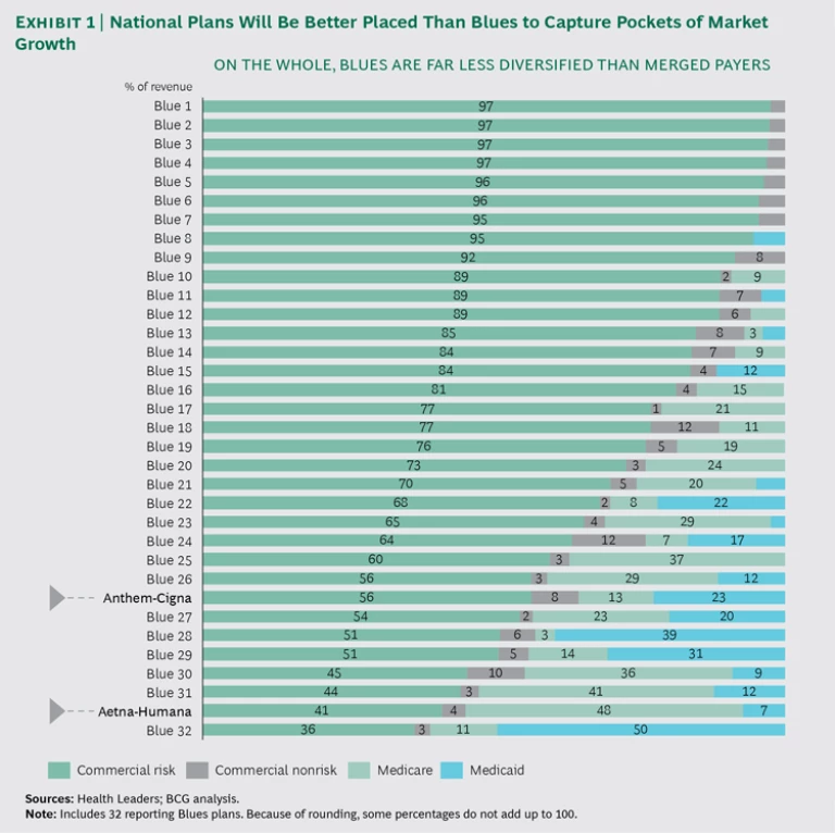With few exceptions, the Blues are less diversified than the Nationals, more focused on slower-growth commercial risk segments, and they have less capital to invest in new capabilities. Yes, their strong, entrenched local relationships, brand, and other advantages will remain relevant going forward. But the Blues will need to act assertively to maintain market relevance and a competitive financial footing in light of the Nationals’ pending mergers. Assuming that the Aetna-Humana and Anthem-Cigna deals are signed later this year, these plans will enjoy advantages over Blues in three main areas.