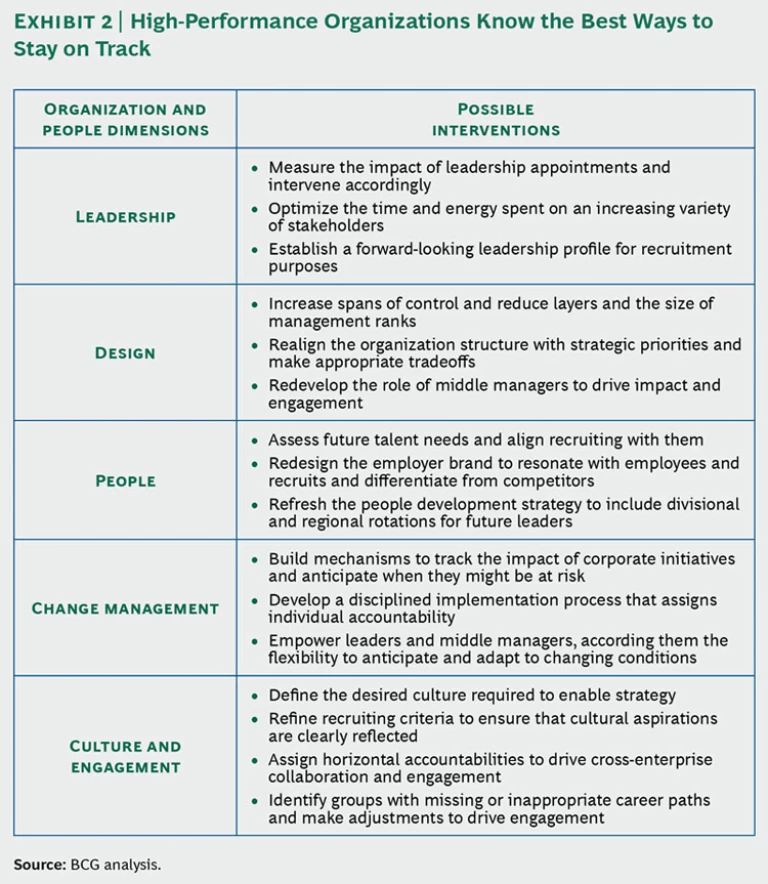 High-performance organizations just work differently. They understand the need to have all 14 characteristics present in their organization and take a coordinated approach to implementing them. They also decide which of the 14 are the most critical to sustained competitive advantage and actively work to improve weak spots by engaging in a disciplined set of interventions and activities. (See Exhibit 2.)