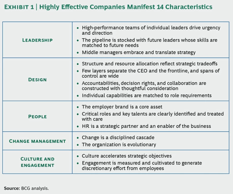 When organizations take a strategic approach to their pursuit of monitoring and improving these five broad capabilities—and the 14 characteristics they represent—they generate lasting performance gains and a competitive edge. (See Exhibit 1.)