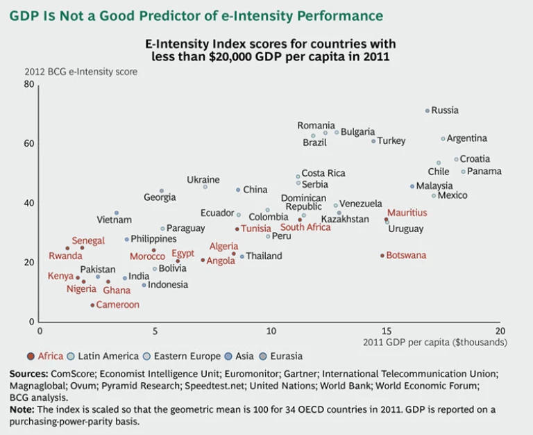 It may seem counterintuitive, but the relatively low state of Internet intensity in African nations gives these countries, and other developing economies, a big opportunity. Unshackled by legacy infrastructure or embedded commercial interests, they can leapfrog their developed counterparts by taking advantage of the next waves of innovation, including mobile access and social networking. Around the world, forward-thinking governments are moving to seize these opportunities, and their rising e-Intensity Index scores reflect these efforts. African governments can do the same.