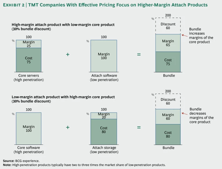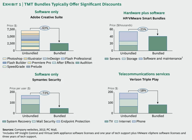 But the dynamics of TMT markets make bundling different and more challenging than it is in other markets. TMT companies often earn high gross margins—from 30 to 80 percent. To convince customers to choose a bundle instead of buying individual components separately, companies must offer a discount. For bundles in which the core product has a low marginal cost—for instance, high-margin products such as software—typical discounts range from 60 to 70 percent, while discounts of 25 to 40 percent are offered on bundles in which the core product—such as low-margin hardware—has a high marginal cost. (See Exhibit 1 for four illustrative examples.)