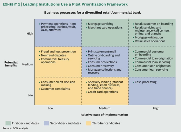 Moreover, selecting a cross-functional process as one of the pilots establishes the program as a core component of the institution’s strategic agenda, helping drive lean principles throughout the organization and fostering collaboration across business lines and functions. Pilot processes are selected on the basis of criteria such as potential overall impact, level of complexity, and effect on the customer experience. A highly detailed diagnostic of processes is required to build a comprehensive lean roadmap, but leading institutions also utilize initial data and executive workshops to prioritize and rapidly identify “no regret” pilots that have strong business cases. (See Exhibit 2.)