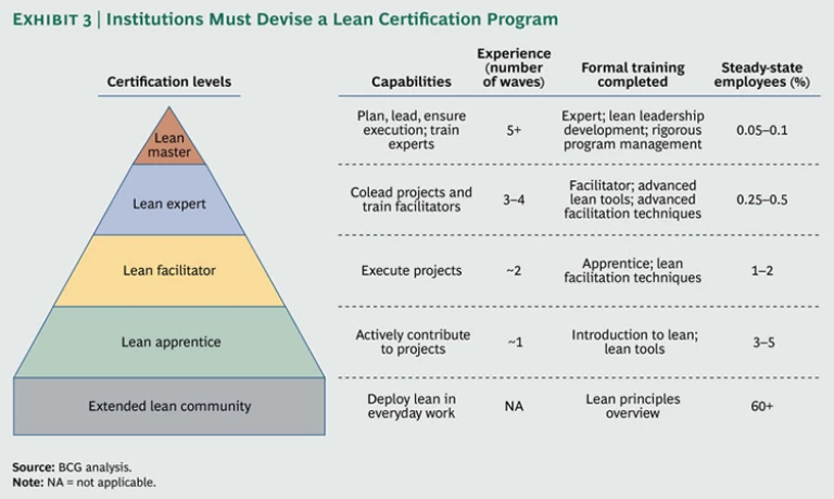 The development of lean capabilities requires on-the-job training—knowledge gained through the hands-on experience of working on lean initiatives—as well as formal classroom sessions. Some institutions set up internal educational centers focused on lean training, sometimes including a lean certification program that tracks the development of capabilities. (See Exhibit 3.) Further, it is critical that the institution dedicate some of its top talent to the lean program. Incentives should be created to ensure that lean projects are attractive both for managers and rank-and-file employees. It is also crucial to disseminate lean concepts and capabilities throughout the entire organization. Lean experts involved in initial waves should be rotated back into different businesses to apply their knowledge. The goal is to ingrain a lean culture into the institution over time, one that becomes fully integrated into day-to-day problem solving and change initiatives.