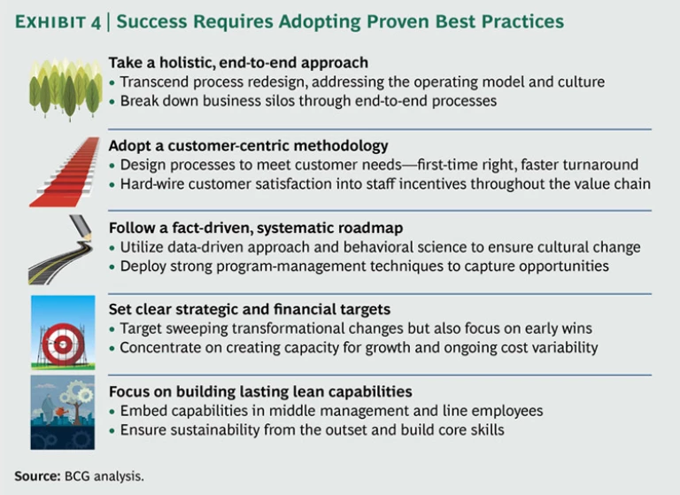 Finally, any CEO or senior-management team launching or accelerating a lean program should keep the following set of core best practices in mind. (See Exhibit 4.) They are all important, but the first two, in particular, are often overlooked.