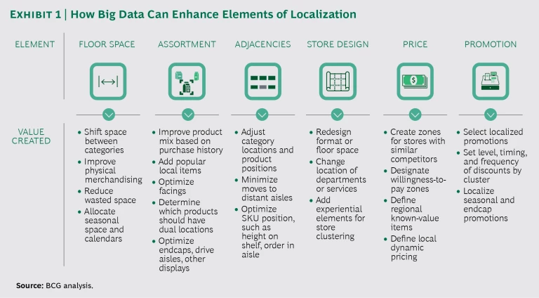 The results of these efforts could reshape every shelf and endcap—every inch of floor space—to attain maximum value. In our client work, we have seen wide-scale, data-based localization improve performance for a variety of retailers: