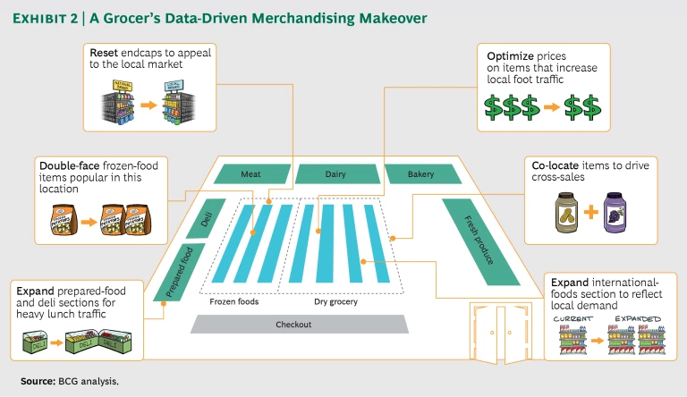 Applying big data to elements of localization can lead to multiple changes. For example, if marginal space productivity analysis showed a lunchtime pickup in foot traffic, a grocery store could expand its prepared-food and deli sections. (See Exhibit 2.) It could double-face items such as a popular size of frozen potatoes after analyzing sales uplift at other locations that added an extra facing of similar items. It could also expand its international-foods section to reflect local demand based on the popularity of existing assortment relative to other stores and customer demographics.