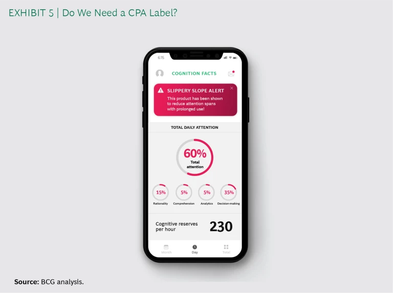 - Cognitive Costs. Task the CFO, CTO, and head of HR with analyzing and measuring the cognitive costs of the technology and tools that the company buys and of the products and services that it sells to customers and consumers. Identify sources of cognitive drain by conducting audits and establishing baselines for bias, load, and capacity; decision-making speed; and employee engagement and wellbeing. Imagine a Food and Drug Administration for cognition (a Cognitive Protective Agency?). What would the label on your company’s products and services say today? (See Exhibit 5.)