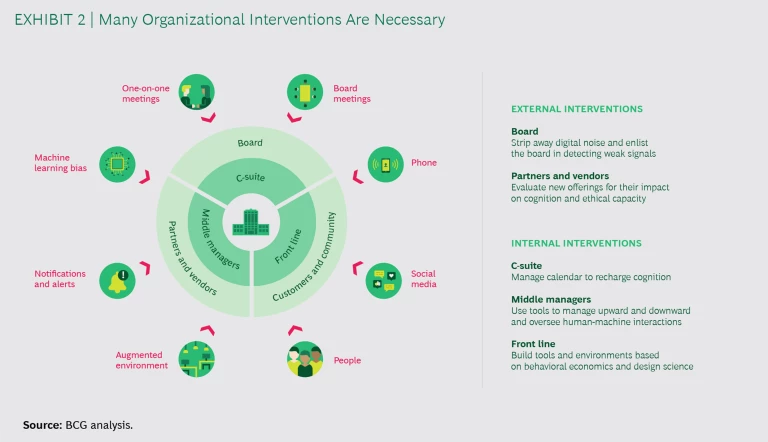 For large organizations, generating cognitive capacity isn’t as simple as dumbing down a laptop, turning off phone notifications, or going for a daily walk, although taking any of those steps would be a good start. Instead, such organizations need a multifaceted approach that addresses cognition comprehensively. (See Exhibit 2.)