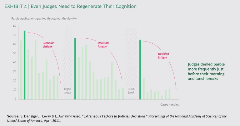 Academics have discovered that the willingness of judges to grant prisoners parole varies during the course of the day. Inmates who appear at the start of the morning session or immediately after lunch are far more likely to be released than those who appear just before lunch. (See Exhibit 4.) As judges work through their docket, they become less and less likely to set prisoners free, even though there is no reason to suppose that the prisoners whose cases come up for review at 11:30 a.m. deserve harsher treatment than those whose cases come up an hour and a half earlier. But cognitively fatigued judges seem to find it easier to return inmates to prison than to expend the cognitive energy necessary to assess their progress toward rehabilitation and decide whether they would represent an unacceptable risk to society if released on parole. And if judges’ temperament and ability to make these decisions swing sharply in response to variations in their cognitive capacity, executives’ temperament and ability surely do, too.