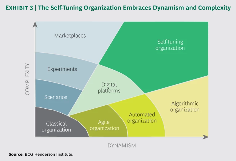 By reconceiving the external and internal workings of the organization as a flexible, evolving ecosystem, businesses can handle much greater dynamism and complexity. This requires subjecting all aspects of the organization to market forces, enabling it to learn and adapt in response to new opportunities. And it requires internal systems that adjust automatically to new information, allowing learning and resource reallocation to occur at algorithmic speed. When combined, these capabilities can create a “self-tuning enterprise” that constantly learns and evolves according to its environment. (See Exhibit 3.)