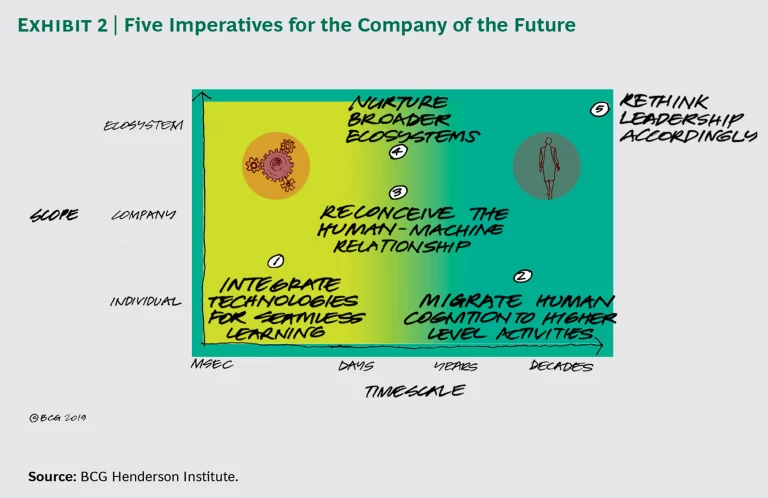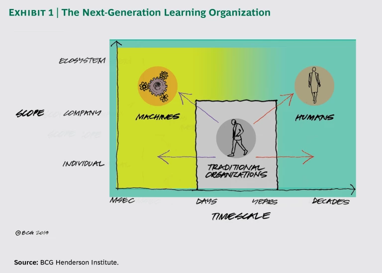 The first two imperatives call for a hybrid learning organization, one that combines the comparative advantages of machines and humans: machines’ ability to rapidly identify complex patterns in big data and humans’ ability to decode complex causal relationships and imagine new possibilities. Together, these will enable the organization to learn on an expanded range of timescales—faster and slower.