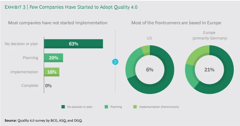 Among all survey participants, only 16% say that their company has started to implement Quality 4.0 (we refer to these companies as frontrunners); only 20% say that their company has started to plan for implementation, and 63% have not even reached the planning stage yet (we refer to these two categories of participants as followers). (See Exhibit 3.) European participants (primarily from German companies) are off to a faster start: 21% are frontrunners, compared with only 6% of US participants. One expert we interviewed attributed European companies’ faster start to the greater prevalence there of a “total quality management” culture, in which companies see initiatives to enhance quality as a long-term investment rather than as a short-term cost. In addition, German companies have been among the global leaders in developing and investing in Industry 4.0 as an overall strategy for improving operations.