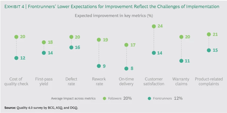 Participants recognize that Quality 4.0 can promote significant improvements in key quality metrics. Notably, however, we found that frontrunners tend to have lower expectations about the magnitude of such improvements than followers do. (See Exhibit 4.) This finding likely reflects the fact that frontrunners have bumped up against real-world challenges to implementation.