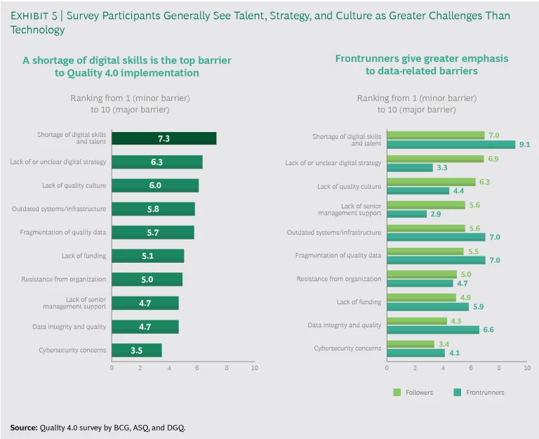Survey participants identified factors unrelated to technology and data as the most significant challenges to implementing Quality 4.0. (See Exhibit 5.) A shortage of digital skills and talent ranked as the top challenge. This shortage leads to fierce competition for digital specialists, both within the company and externally. An unclear digital strategy ranked second among the most important barriers to implementation, and lack of quality culture ranked third.