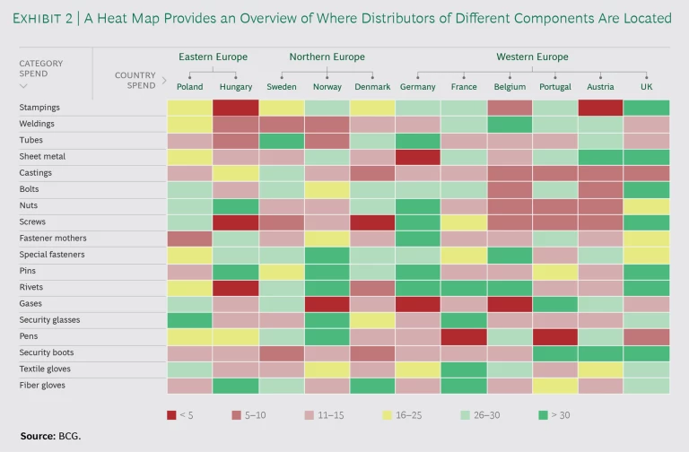 Today, companies can issue a large-scale eRFI to many suppliers (distributors) around the world. The vendors, in turn, can provide information—quantities, prices, and delivery timelines—about the products they can supply. The number of distributors in each country for each product can then be illustrated with a heat map. (See Exhibit 2.)